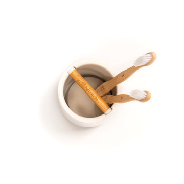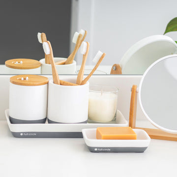 Our bathroom collection offers a functional array of white & gray accessories. Designed with a non-scratch base to protect your bathroom countertop. A Dry Earth disk keeps mildew from forming at the bottom.