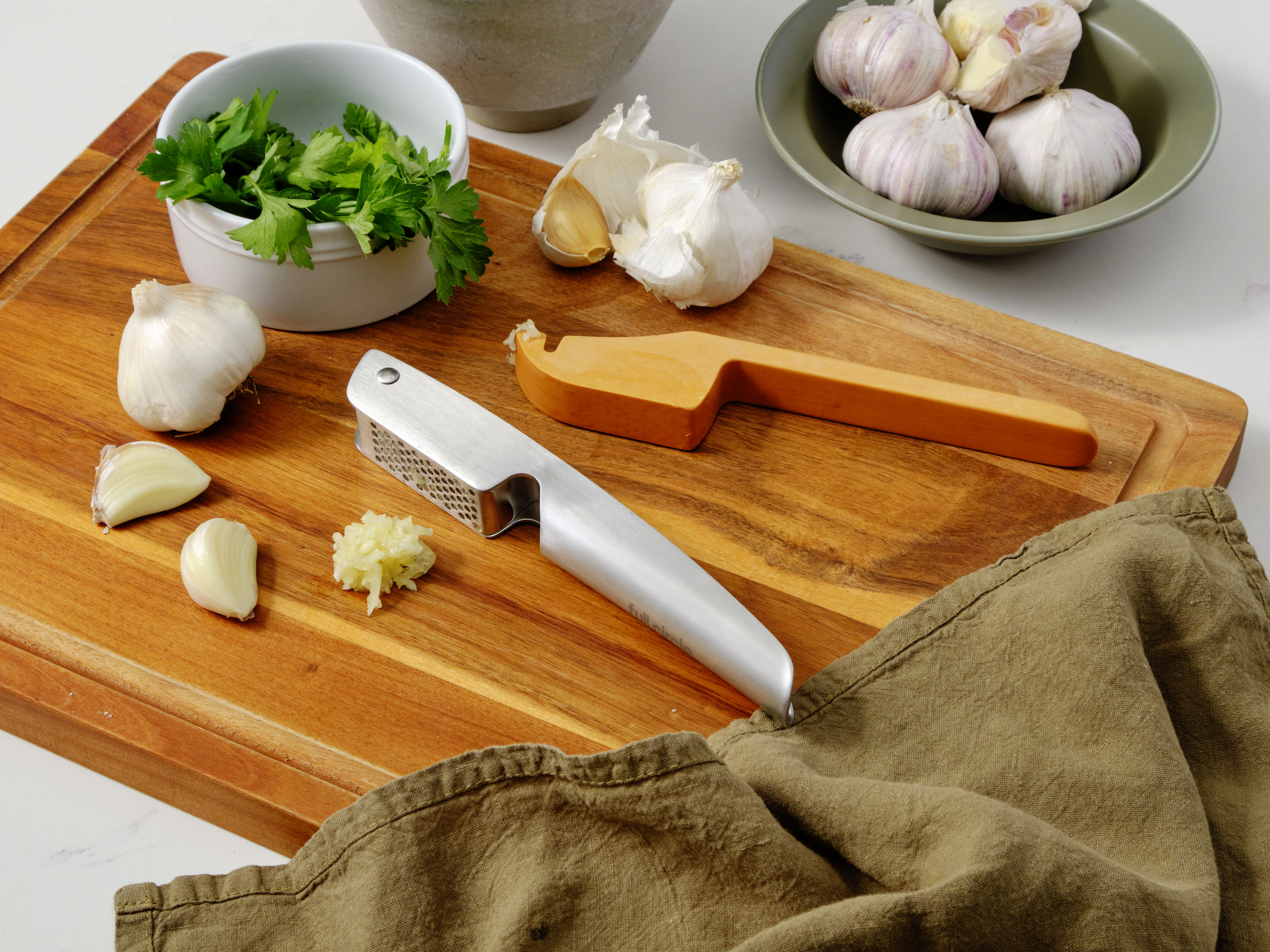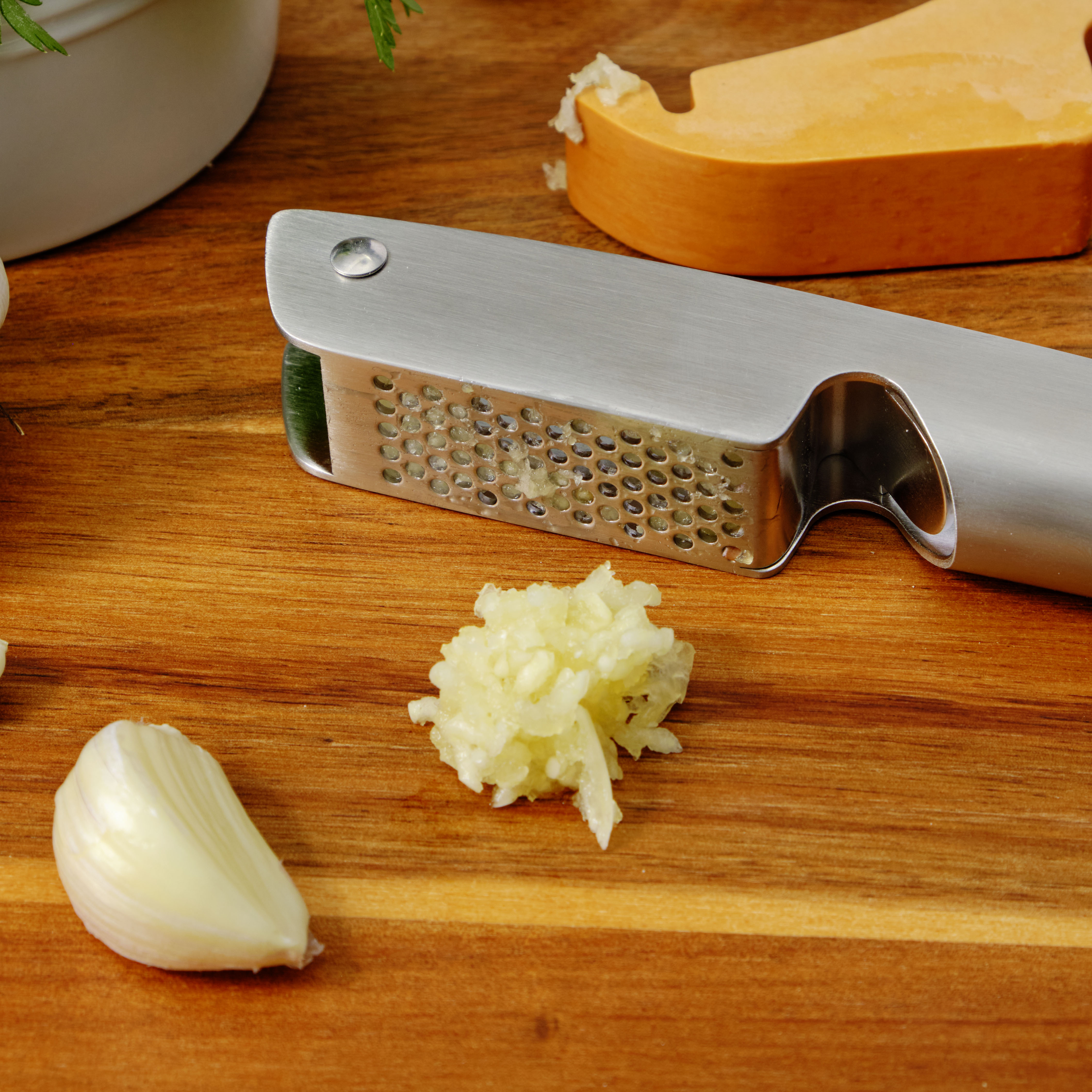 - Integrated scraper handle removes pressed garlic and leftovers without the need for a separate cleaning tool, keeping your hands clean of garlic!