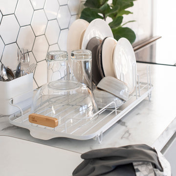 To help your dish rack stand up to decades of dish-drying, it’s best to hand wash the stainless steel tines. The drain board and utensil holder are dishwasher safe, but only on the top rack. Otherwise, we’d recommend hand washing them with a brush, too.