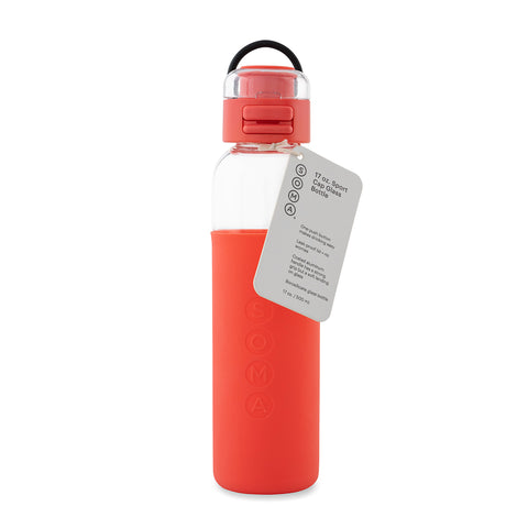 A smooth, ergonomic mouth is one push of a button away, the leakproof lid locks in place, and the coated aluminum handle makes carrying a breeze — all with the sleek design of our classic glass Soma bottle.